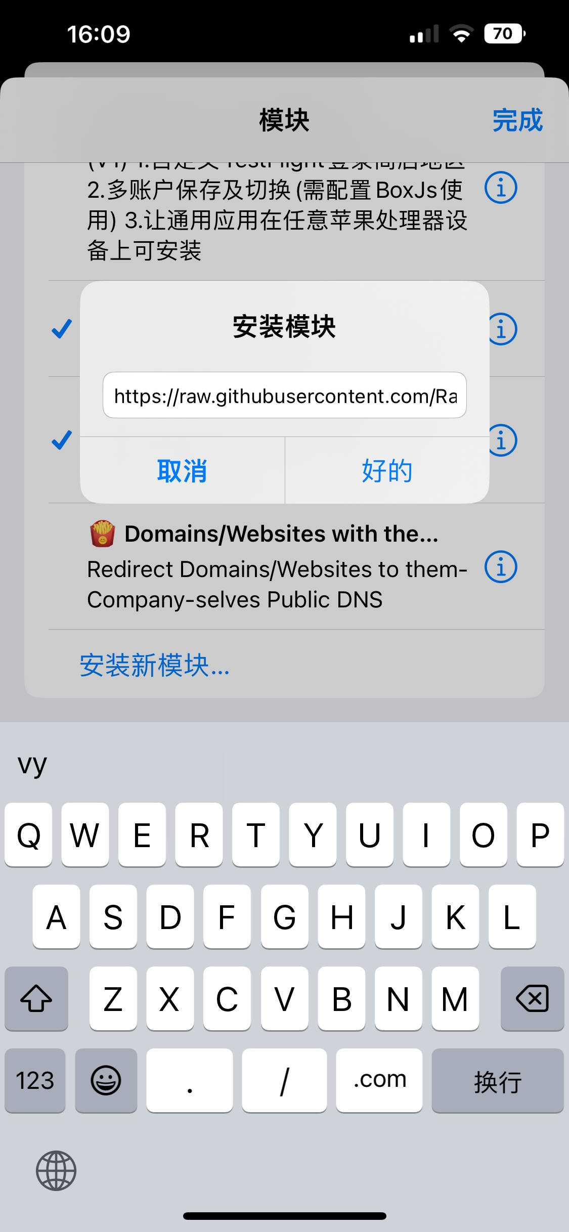 这时可以在浏览器的底部选择网址,全选后复制,切换到surge的首页-模块-选择安装新模块,并将复制的模块地址填入并选择安装保存即可。
