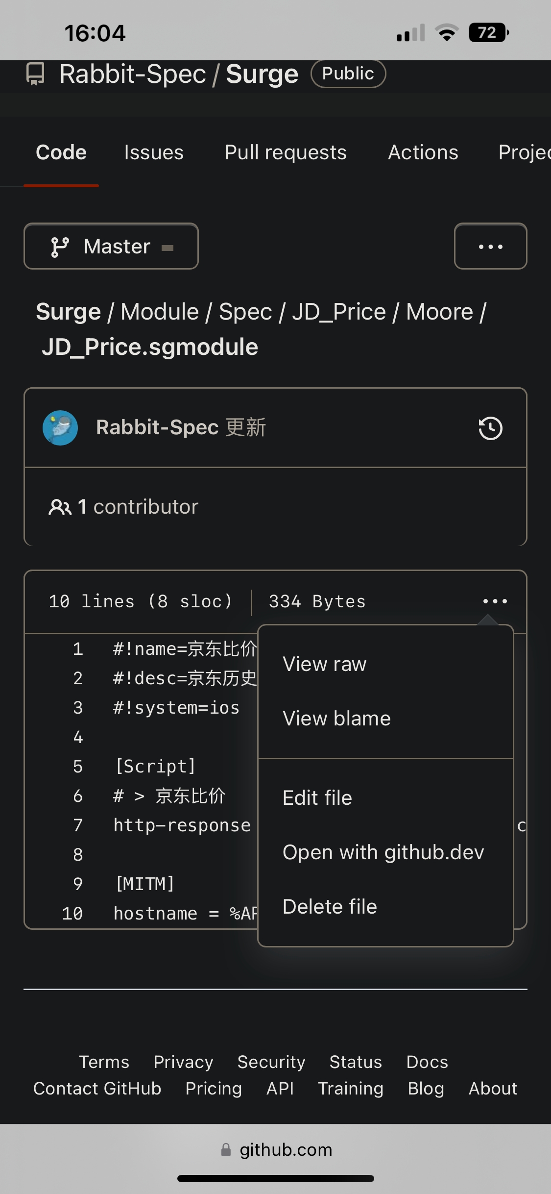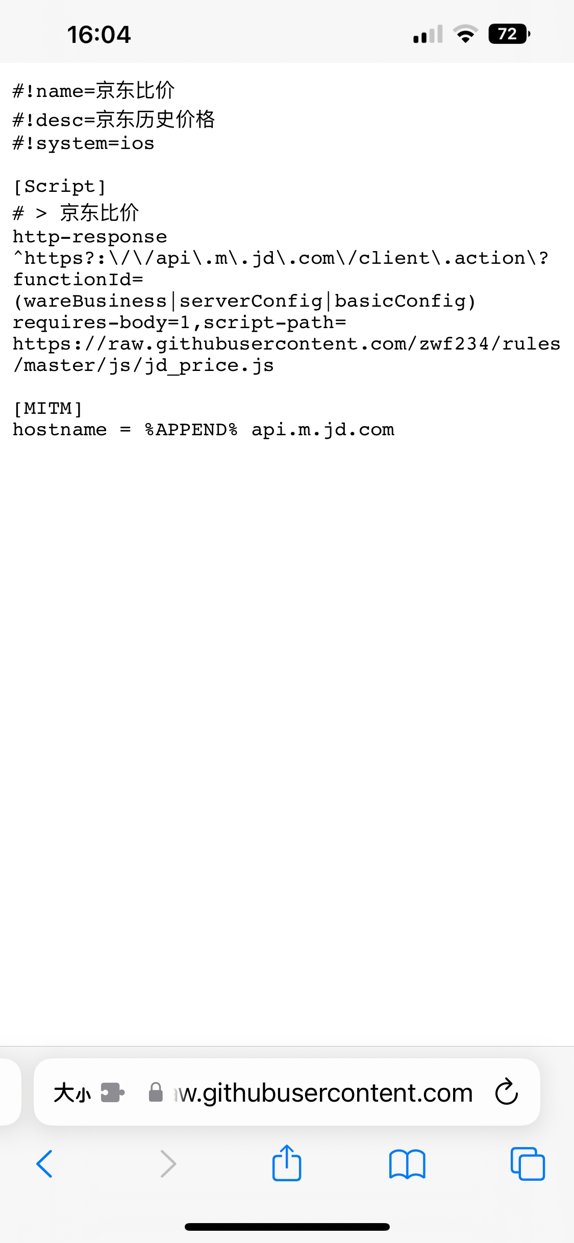 找到作者的GitHub库(或者别人发的模块链接)这里以深巷有喵的库为例:一般作者模块的文件夹都是以module命名,点进去后找到想要的模块,这里以京东比价模块为例,找到后点击文件右上角的view raw 会跳转到内容页面