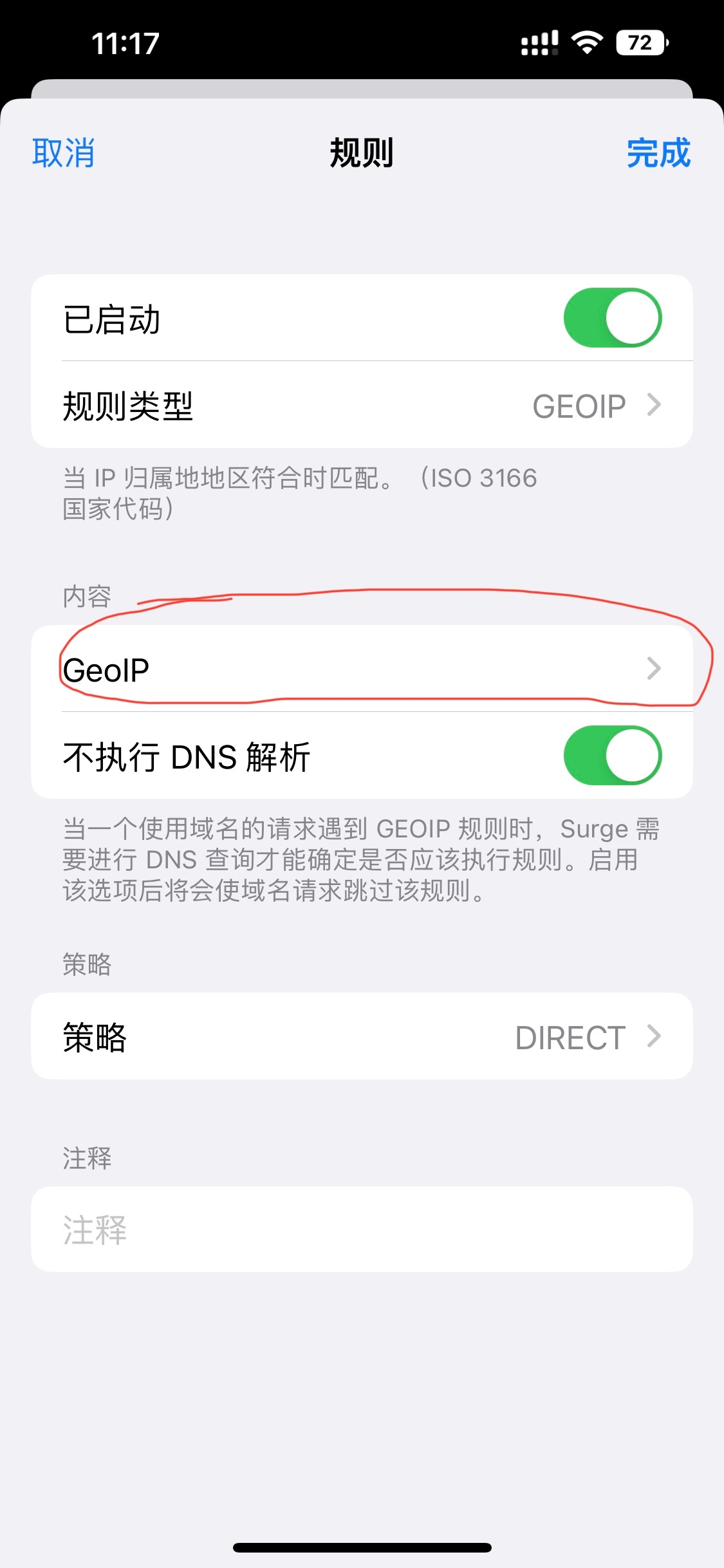 这里我以一个制定GEOIP为中国的就走直连为例:选择规则类型为GEOIP,然后在GEOIP 里面选择CN(中国),并选上不执行DNS解析,策略里面选择DIRECT,保存后就得到了一个规则了。
