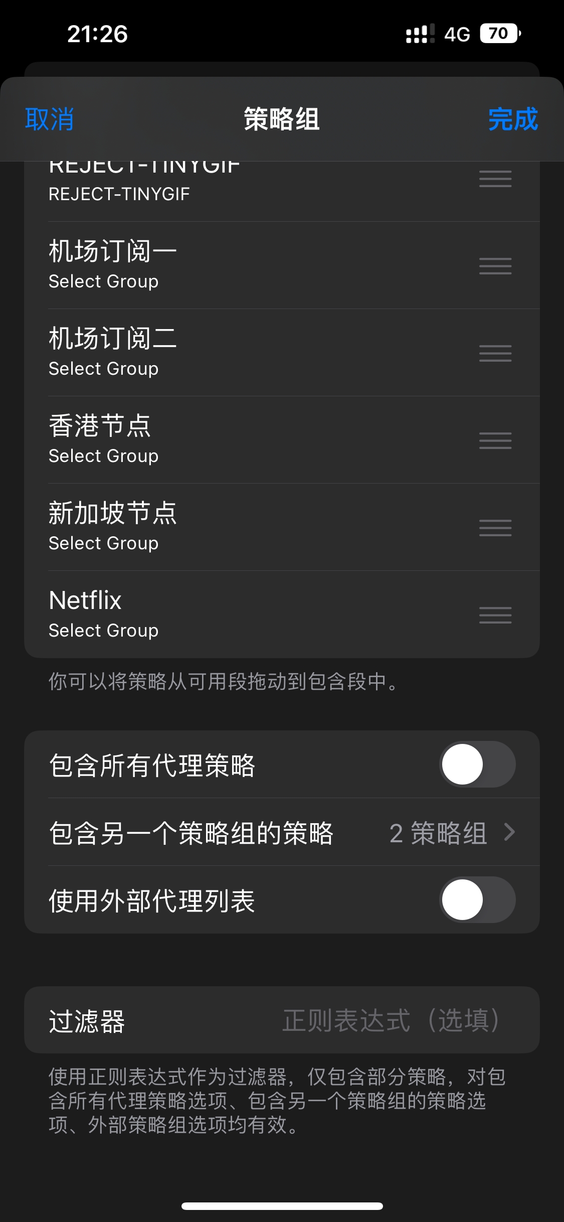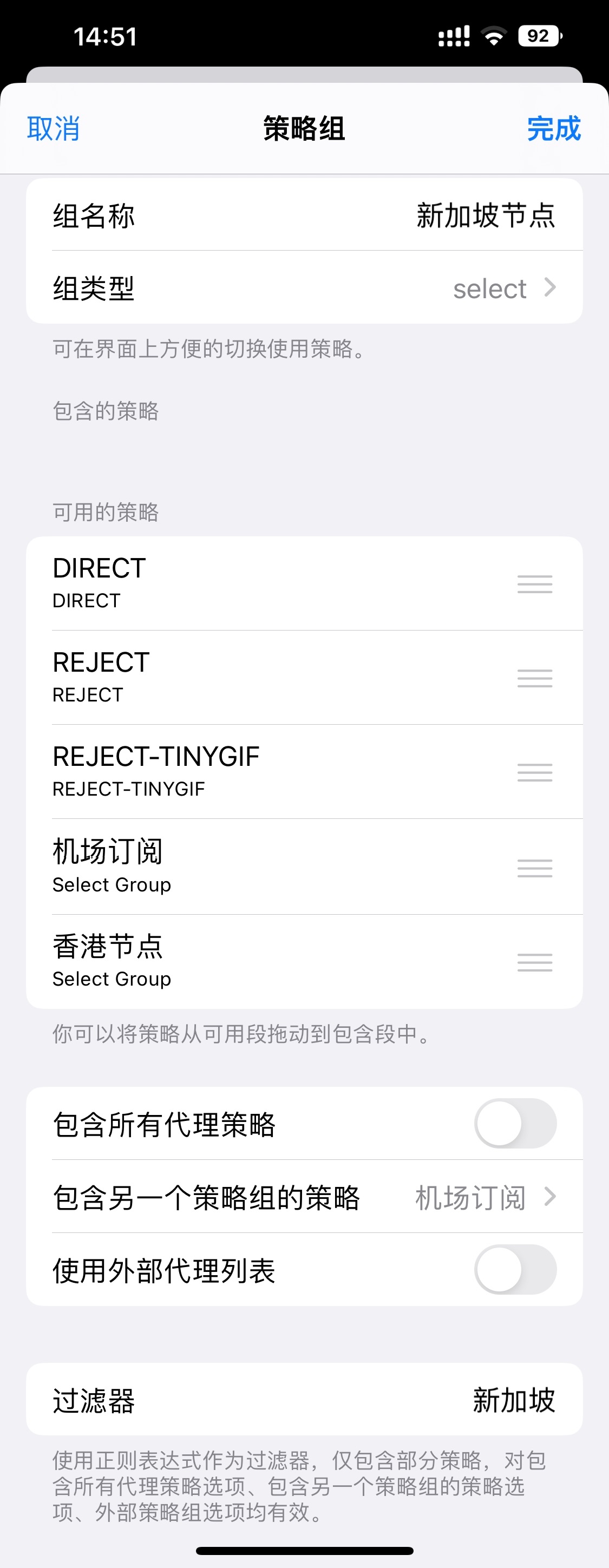 前面方法类似,新建策略组,命名为新加坡节点,但是这里不使用外部代理列表,而是选择包含另外一个策略组的策略,并选中包含所有节点的机场订阅,并在底下的正则筛选中输入新加坡,就会得到一个只包含新加坡的节点的策略组了。