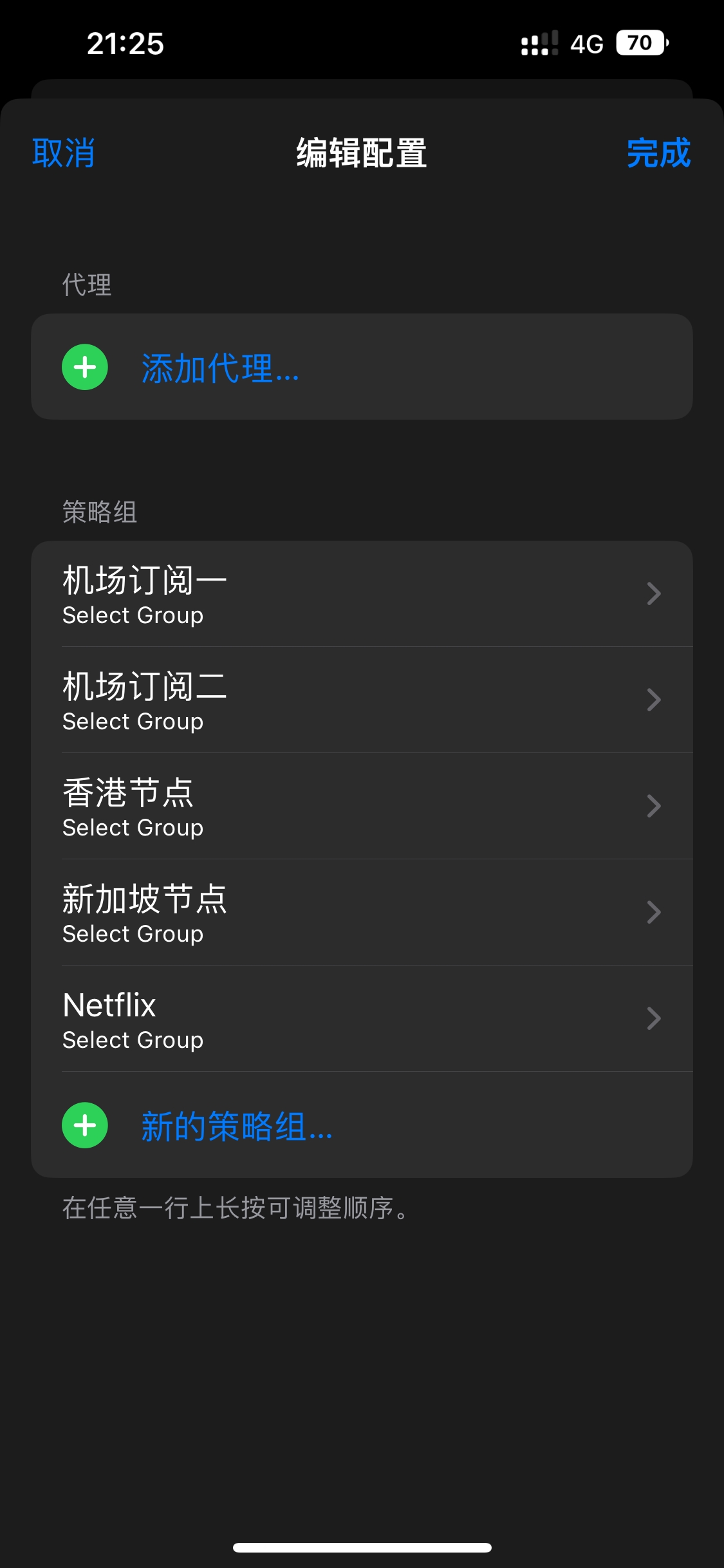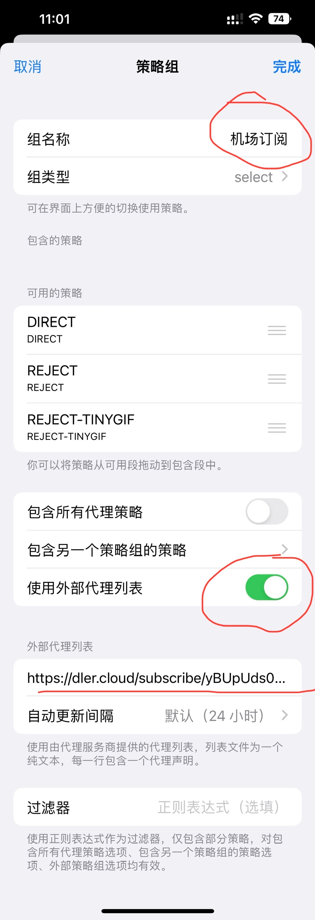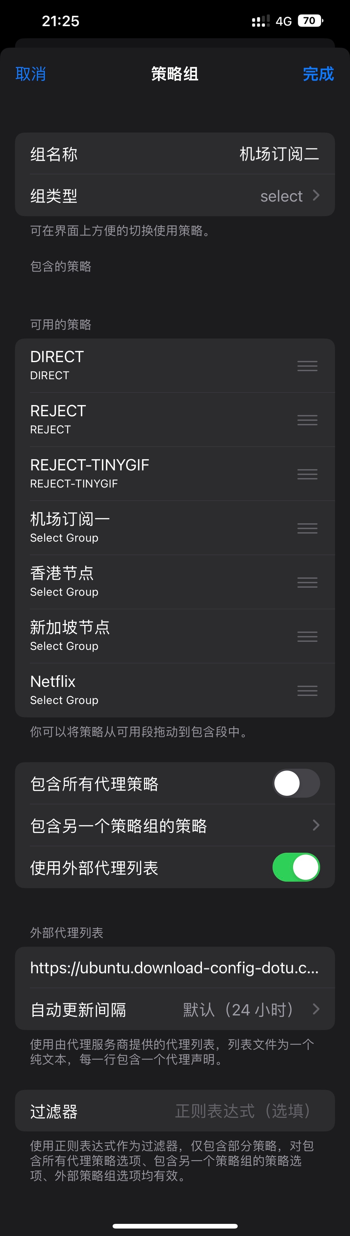Provider(订阅)点击复制后就会得到一个链接,这时候可以去surge首页的配置文件选择页面里面选择新建一个空白配置,取名那些就随你自己了,建好空白配置后点击代理服务器,再点击新的策略组,策略组的名字就随意了。拉到下面点选上使用外部代理列表,将你从机场得到的订阅(托管)链接粘贴进去,点击右上角的完成保存,至此你就得到了机场的节点并且学会如何导入订阅了🌝