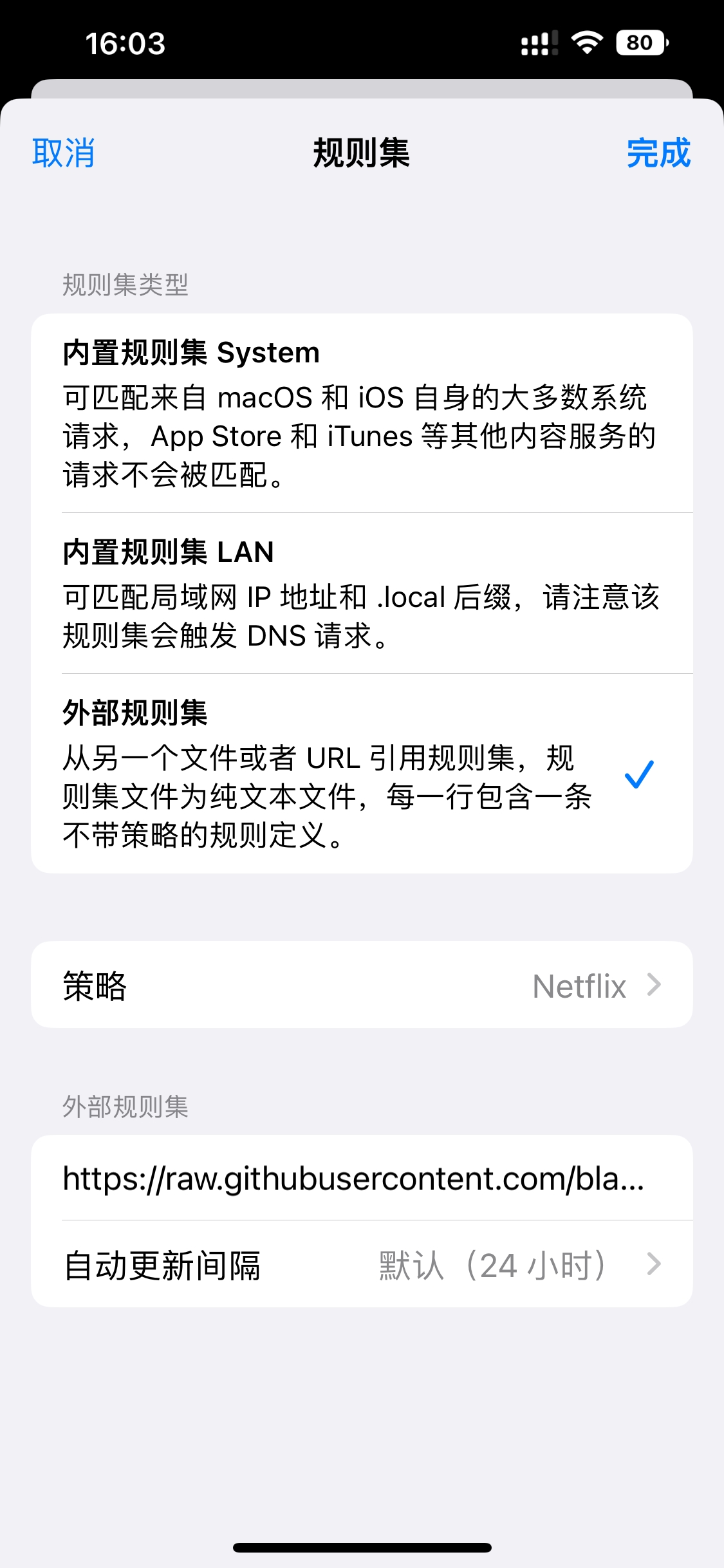 然后去Blackmatrix7的GitHub里面找到Netflix的分流,复制好RAW地址后,在surge里面代理规则-增加规则集-外部规则集,在底下的粘贴上地址后,策略里面选择Netflix并保存,以后就可以在看Netflix时候根据需要选择区域了。