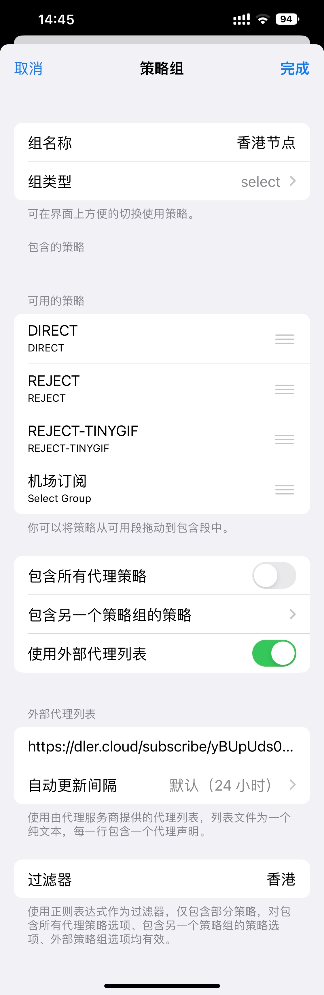 先说订阅筛选,还是如同刚开始的导入机场订阅一样,新建一个策略组,取名叫做香港节点,然后使用外部代理列表,贴上机场订阅,区别就是在底下的过滤器中输入香港,保存后就可以在策略组页面看到只包含香港的节点的策略组了。