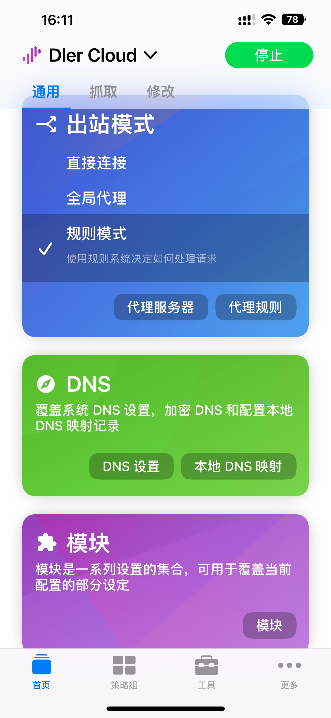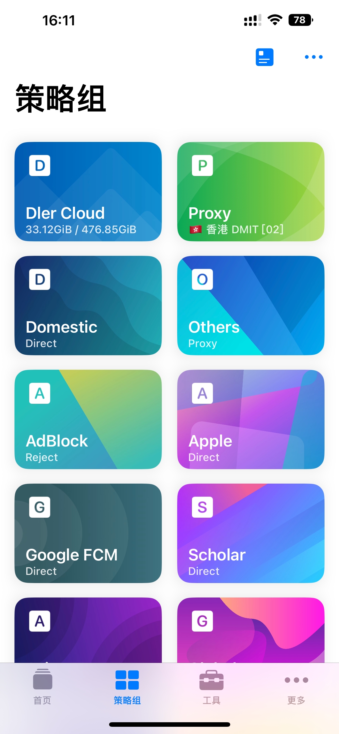 依此类推就可以给其它的app建立策略组并进行分流了。然后就可以根据自己的需求和喜好来建立自己的个性配置了。 顺便推荐一个基于surge作者推荐的官方配置进行了小幅修改并自带了我的warp节点的配置:
