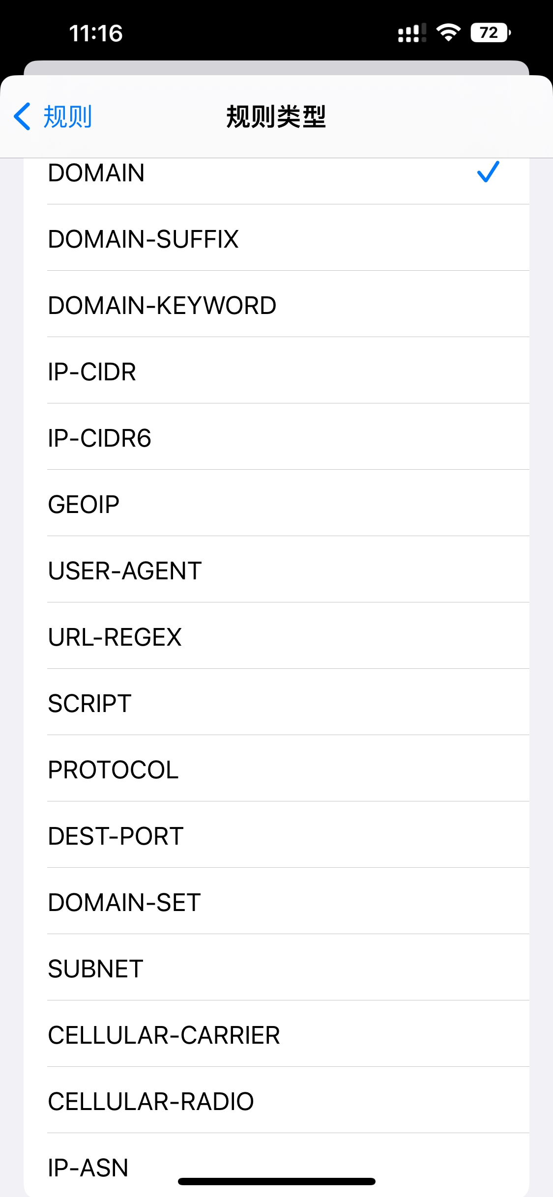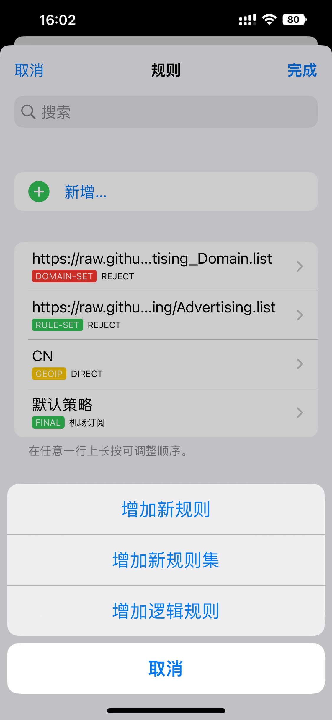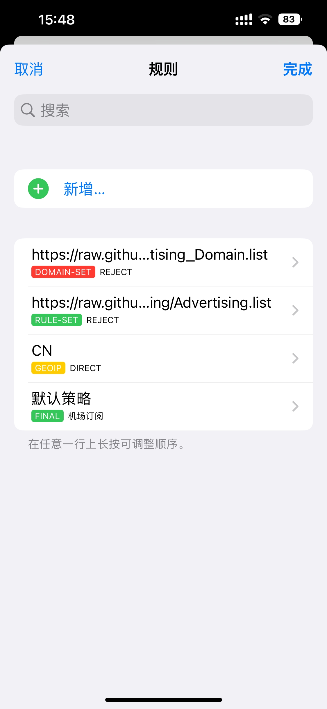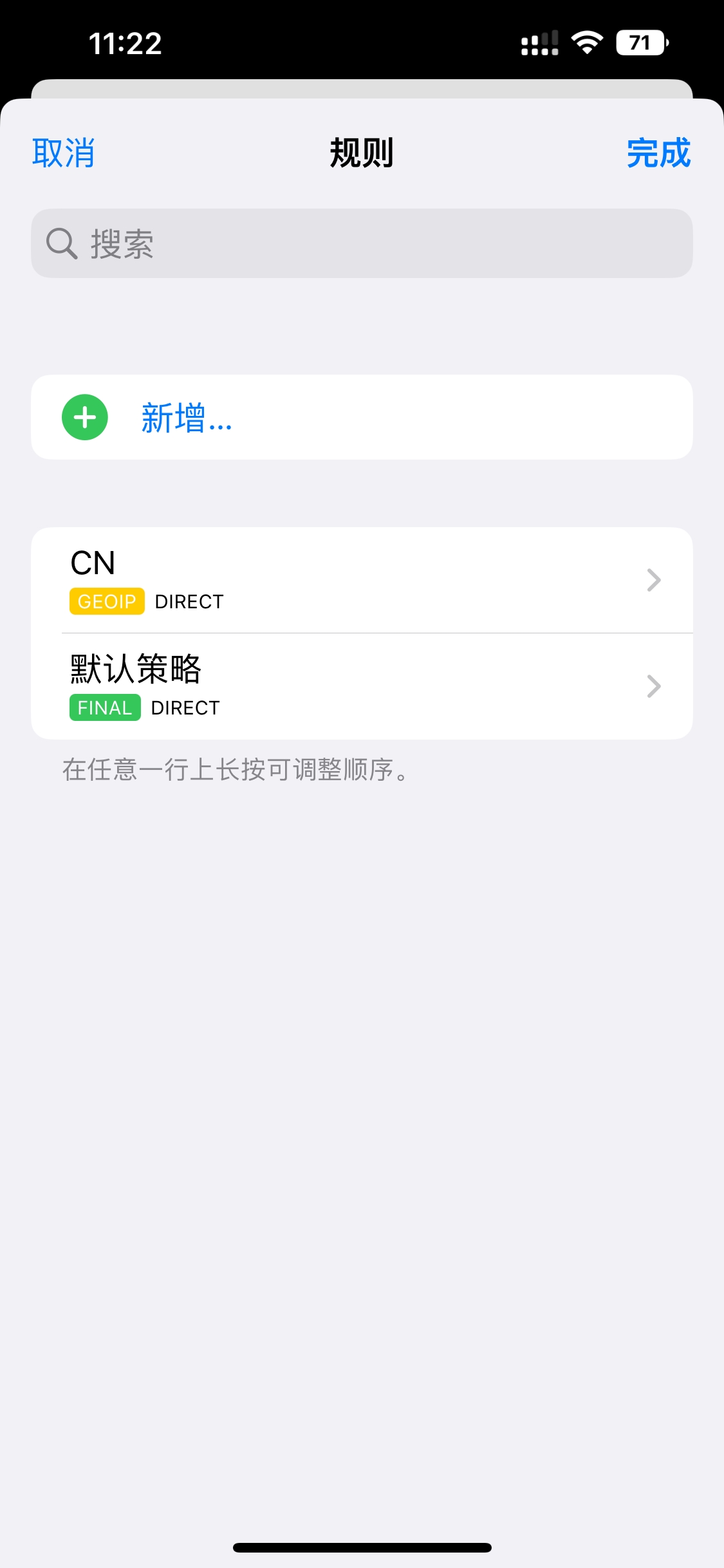 其它类型的也是按照类似的方式进行添加和进行。而这时,如果我们在规则页面,将最底下的默认策略(也就是参数final,常说的兜底),更改为机场订阅,那么我们就基本已经可以用使用surge了,这时候的规则就是中国IP的,直接连接,除此之外的,走机场订阅里面选择的节点。