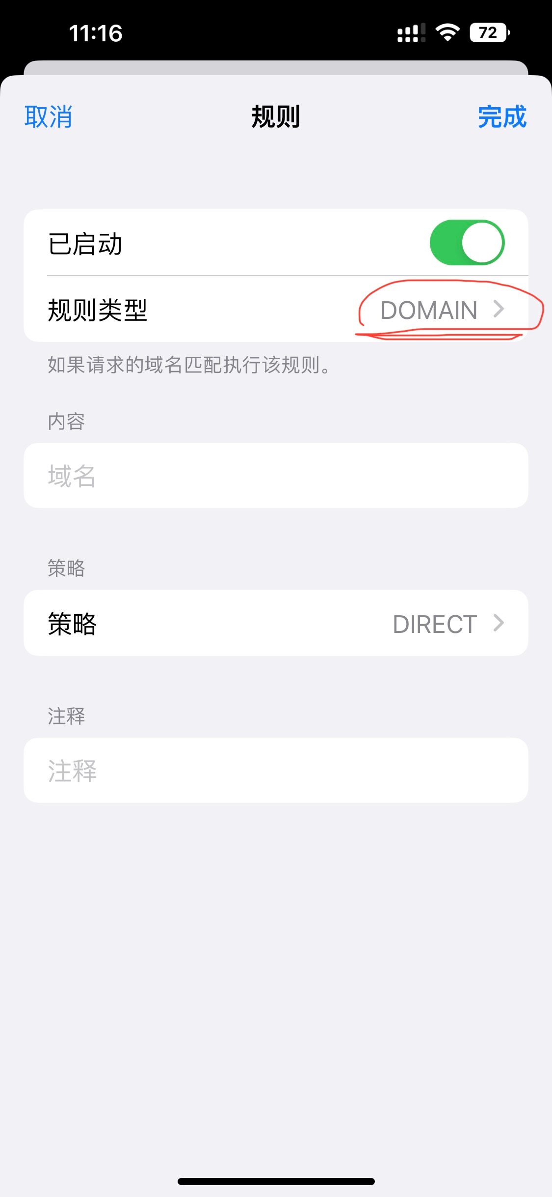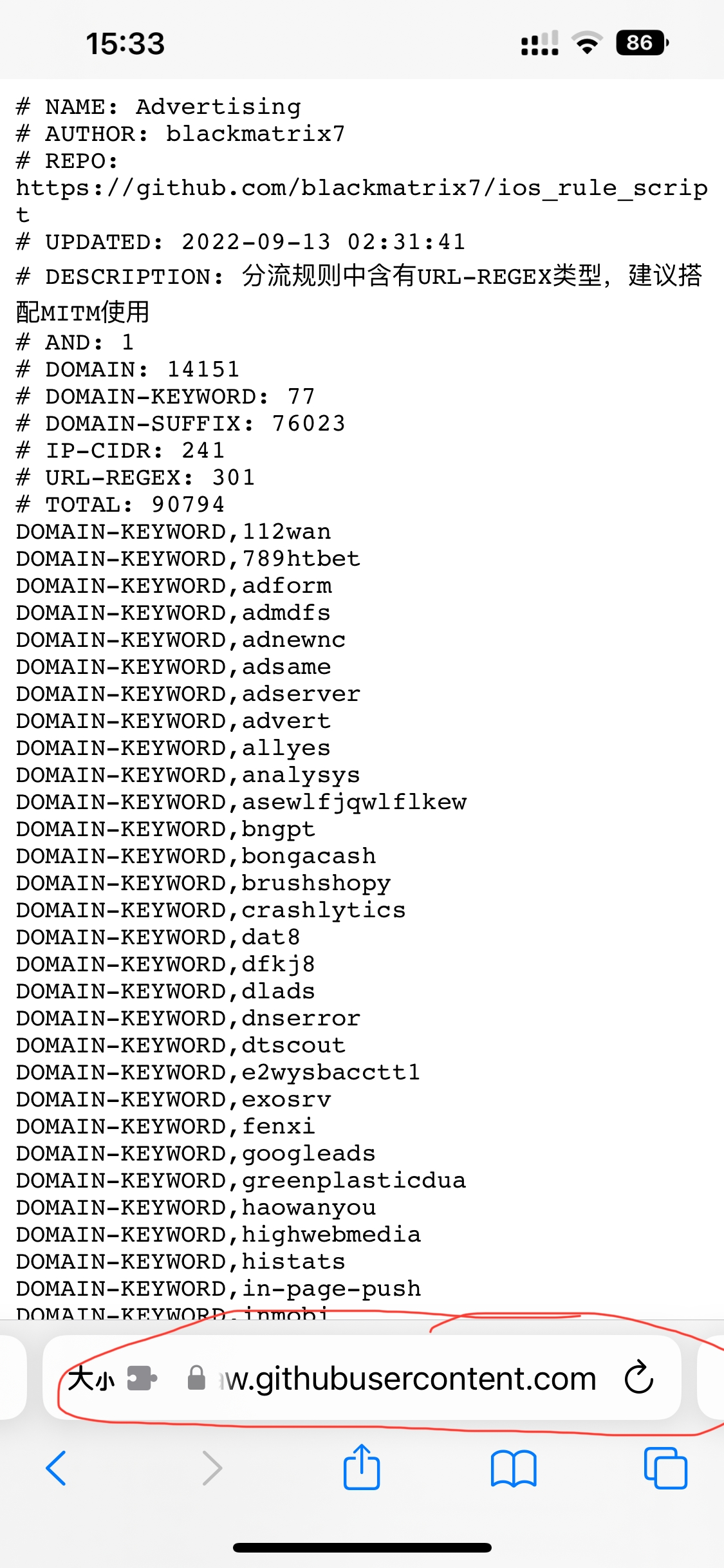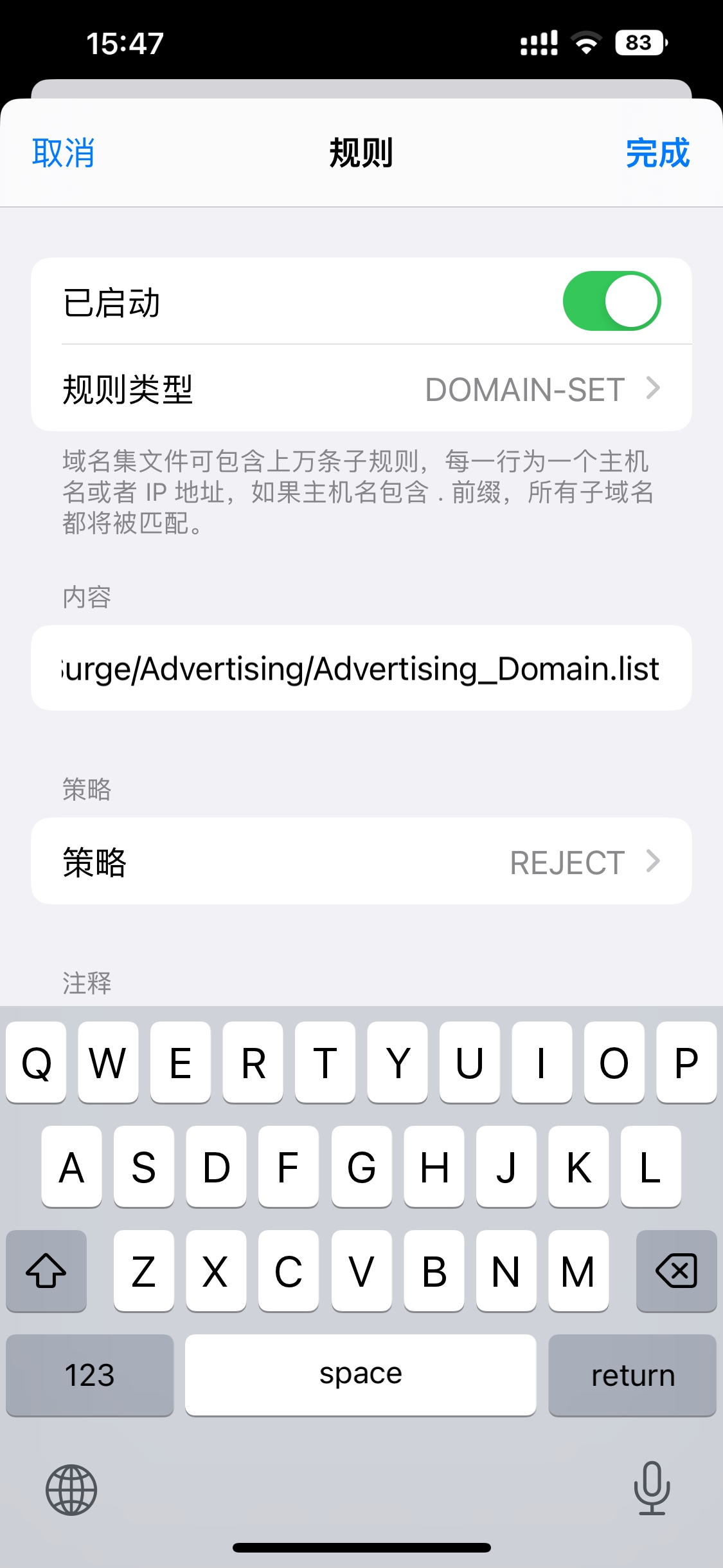 这里新手比较容易迷惑的一点就是底下有个说明:Advertising_Domain.list采用Domain-Set,是的就是域名规则,这种添加方式不是增加规则集,而是增加规则,规则类型为Domain-set