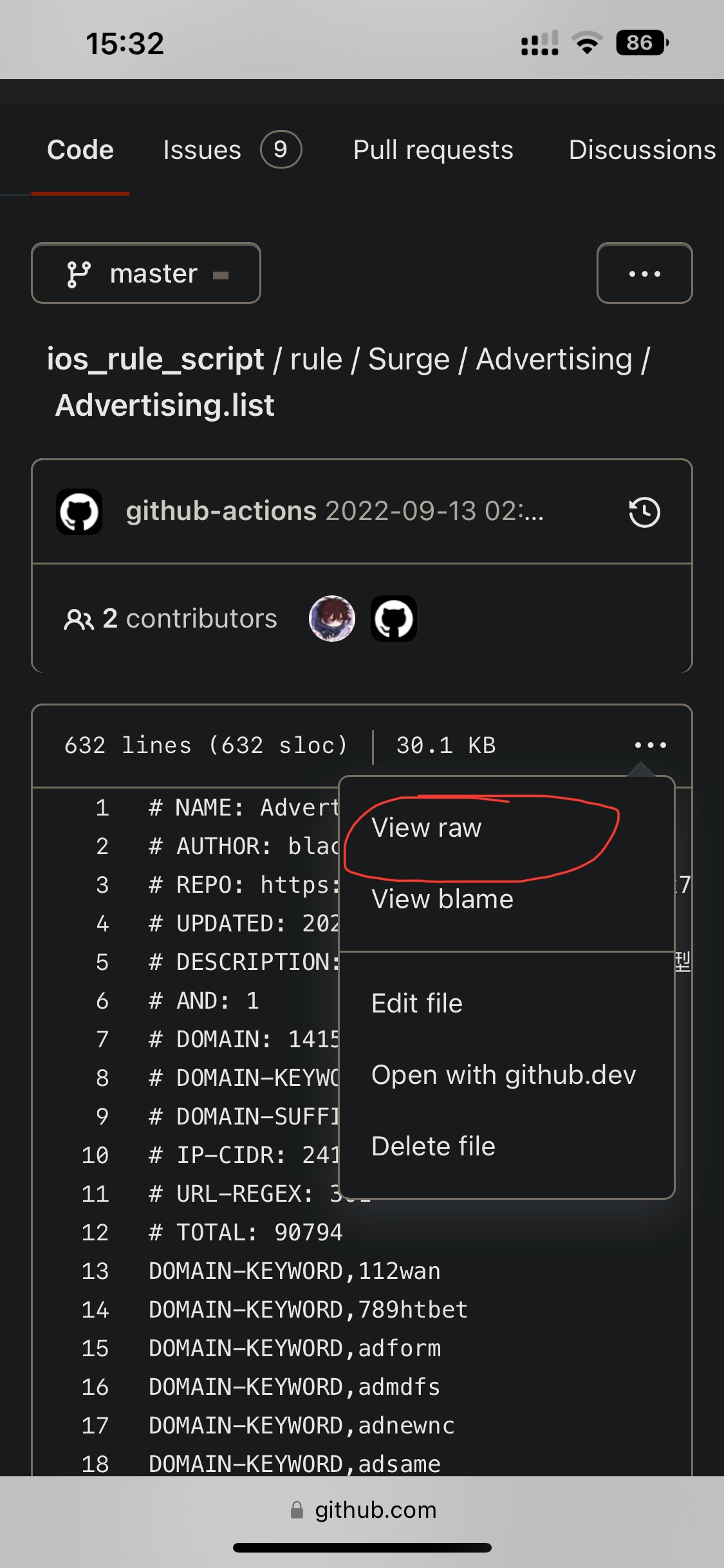 而在通过找到rule- surge- advertising后,通过点击页面…处的RAW即得到链接的地址,复制这个RAW的地址到surge的主页,选择代理规则里面的增加新规则集(这种一个list里面包含了很多条规则的都是属于规则集),选择底下的外部规则集,而因为是去广告的,策略当然是REJECT(拒绝)