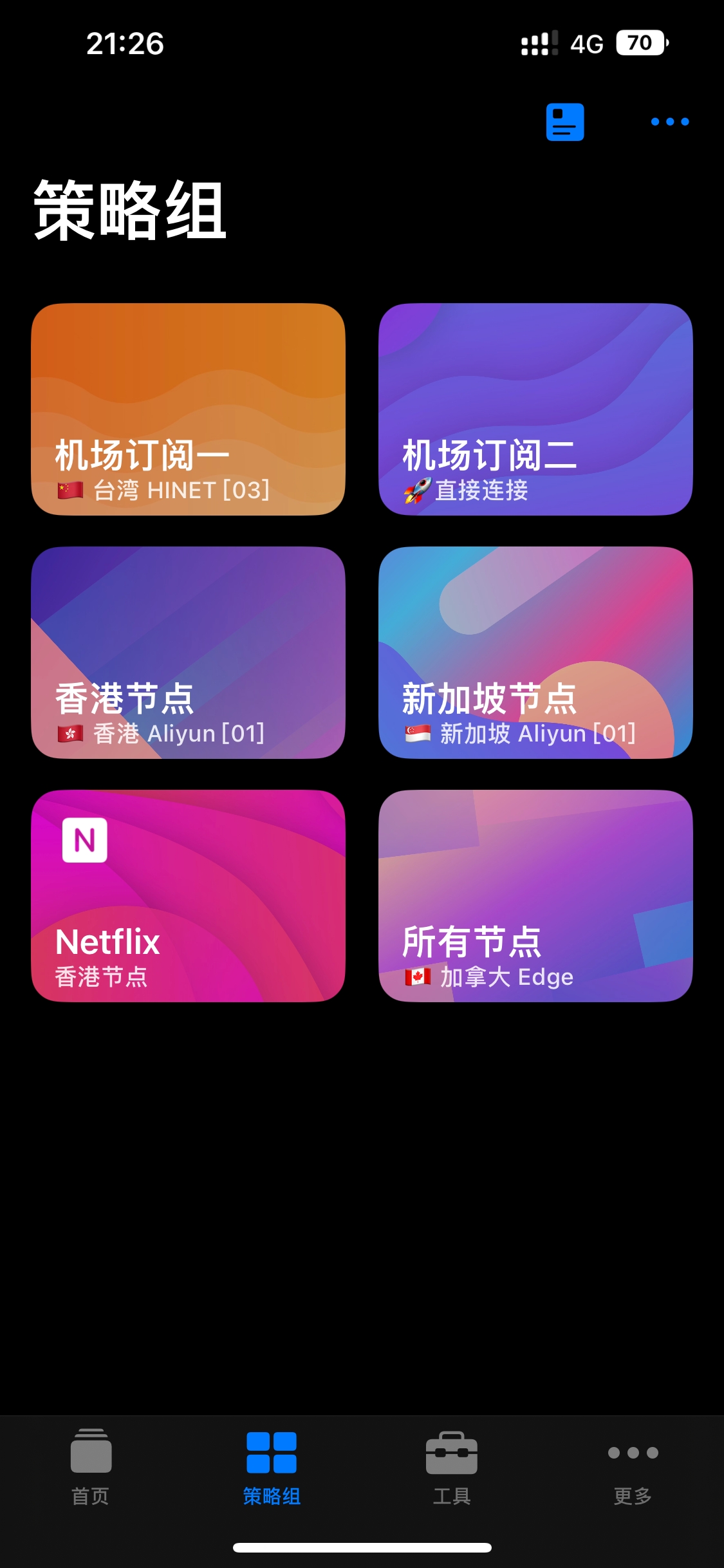 如果明白了这两种操作方法,你在拥有多个机场订阅的时候就可以对他们进行统一的筛选和分组了。方法为:建立机场一策略组,建立机场二策略组,再建立一个策略组所有节点来包含机场一和机场二,然后所有的节点筛选就通过对所有节点策略组来进行。