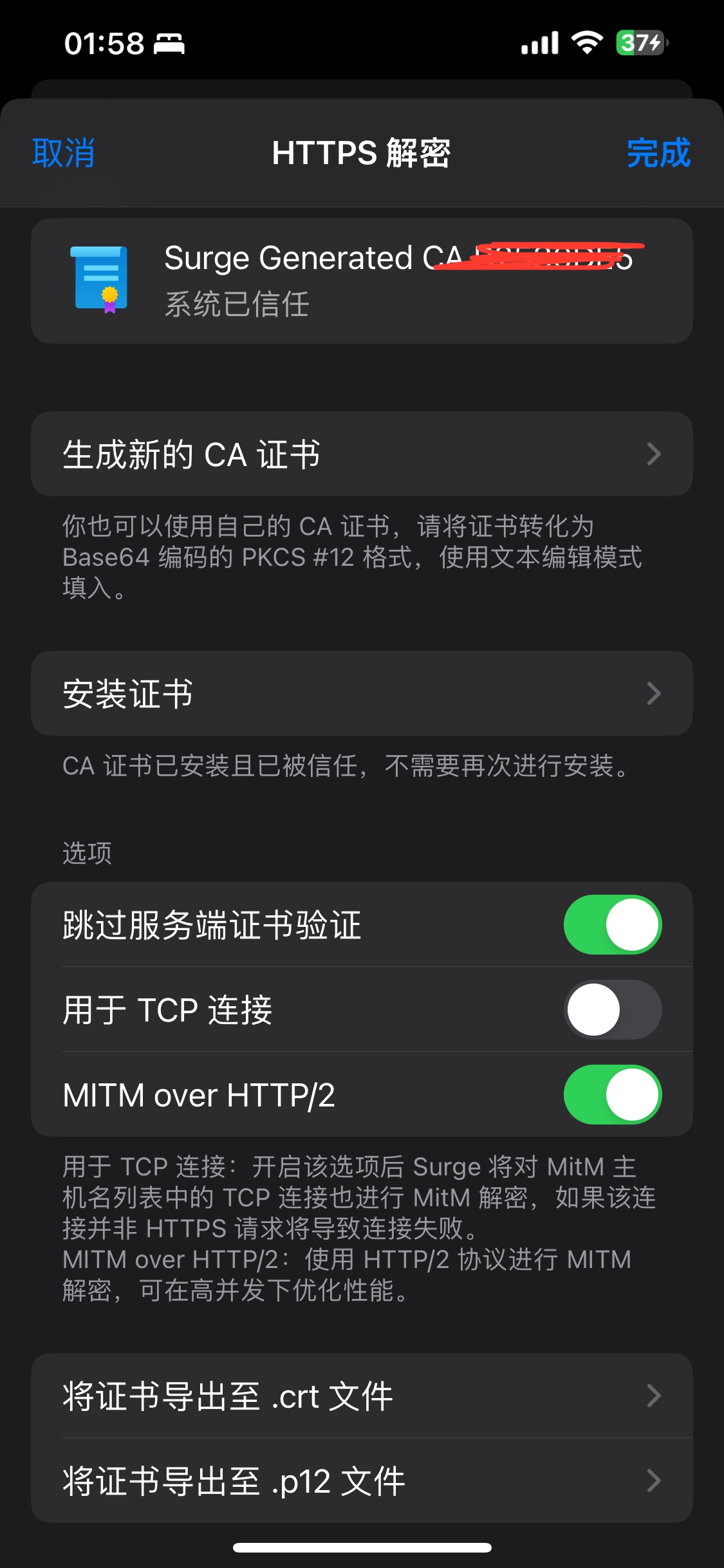 使用前请将脚本、rewrite、MITM这几个开关打开,配置根证书按照如下图生成证书并信任,如果新手那是肯定有H2订阅功能的,能开就打开吧,毕竟花了钱的功能。
