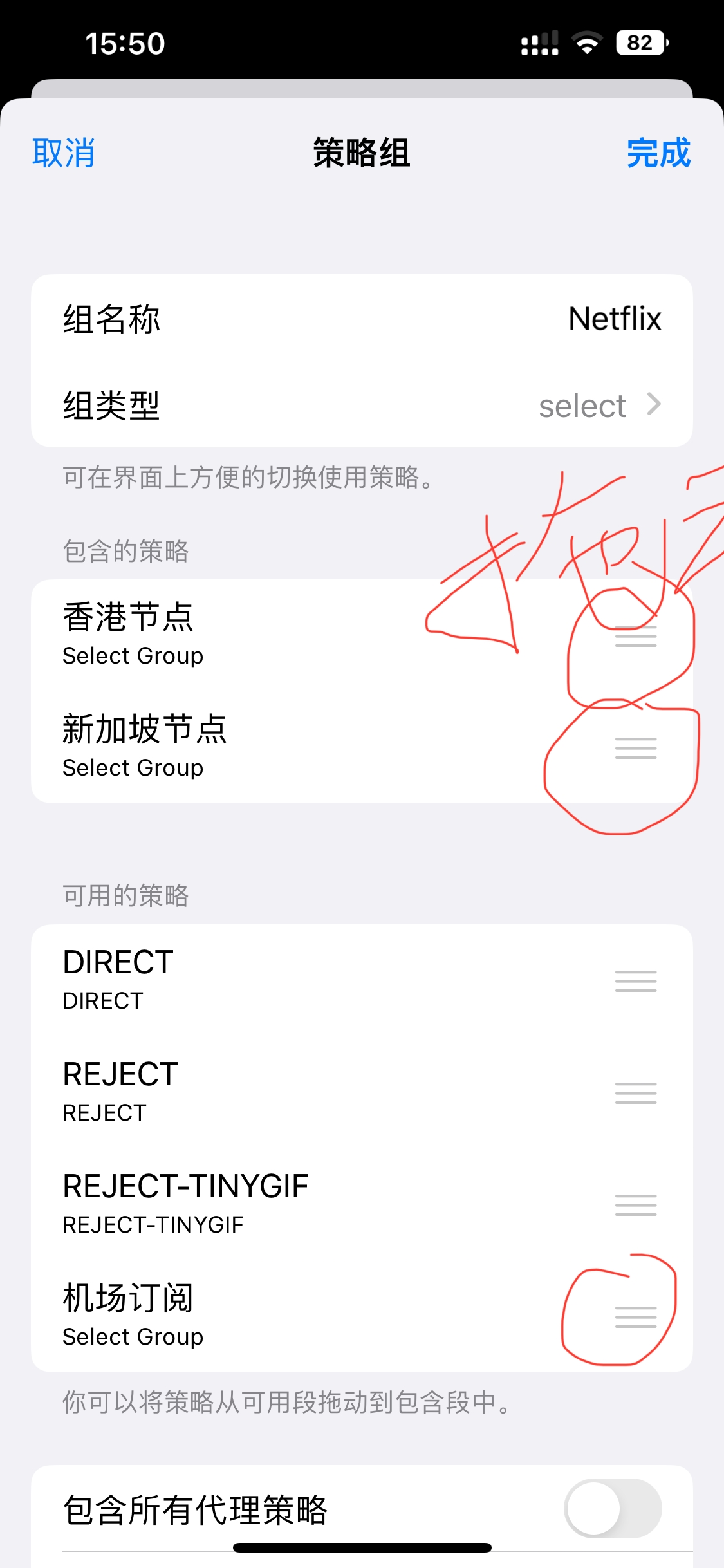 这里以Netflix为例,先建立个策略组:Netflix,然后包含香港节点和新加坡节点两个区域策略组:将香港节点和新加坡节点这两个策略组从可用的策略拖动到包含的策略里面并保存。