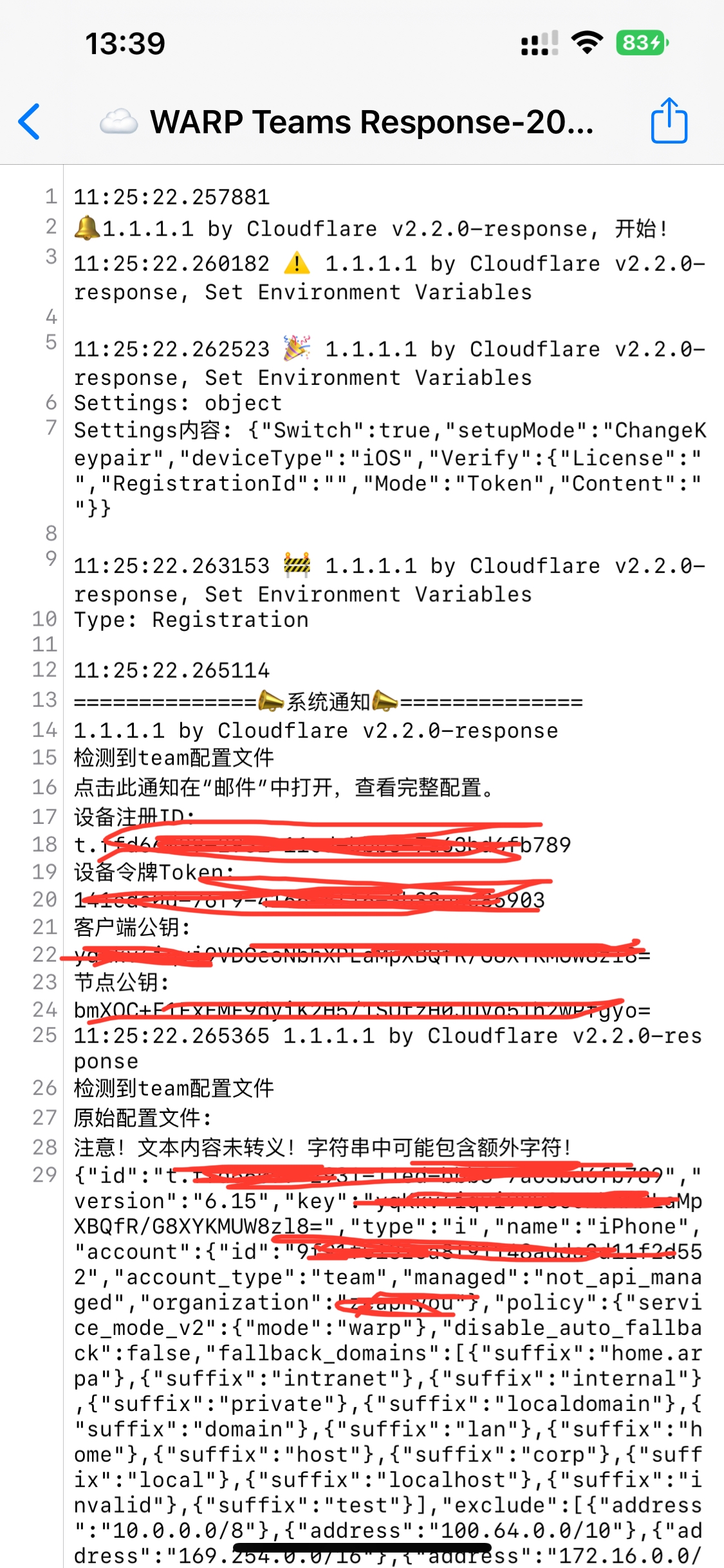 #第七步:打开一次1.1.1.1 app ,surge会有一个提示公钥 设备注册ID等等,也可以进入surge的工具-日志拉到下面点开warp team response ,找到里面的设备注册ID,设备令牌数据,可以提前复制出来备用。