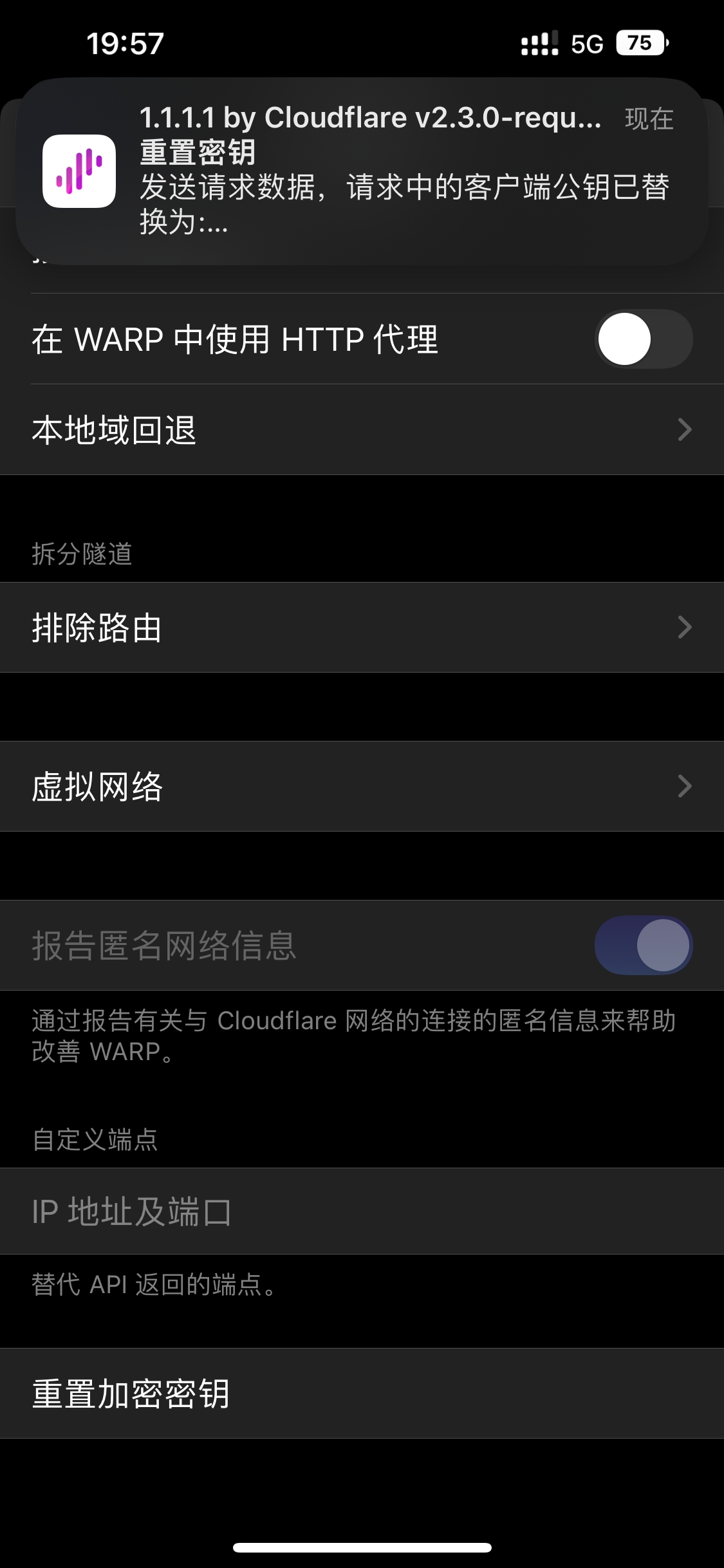 #第九步:打开1.1.1.1 app,进入设置 高级 链接选项拉到最底下的重置加密密钥