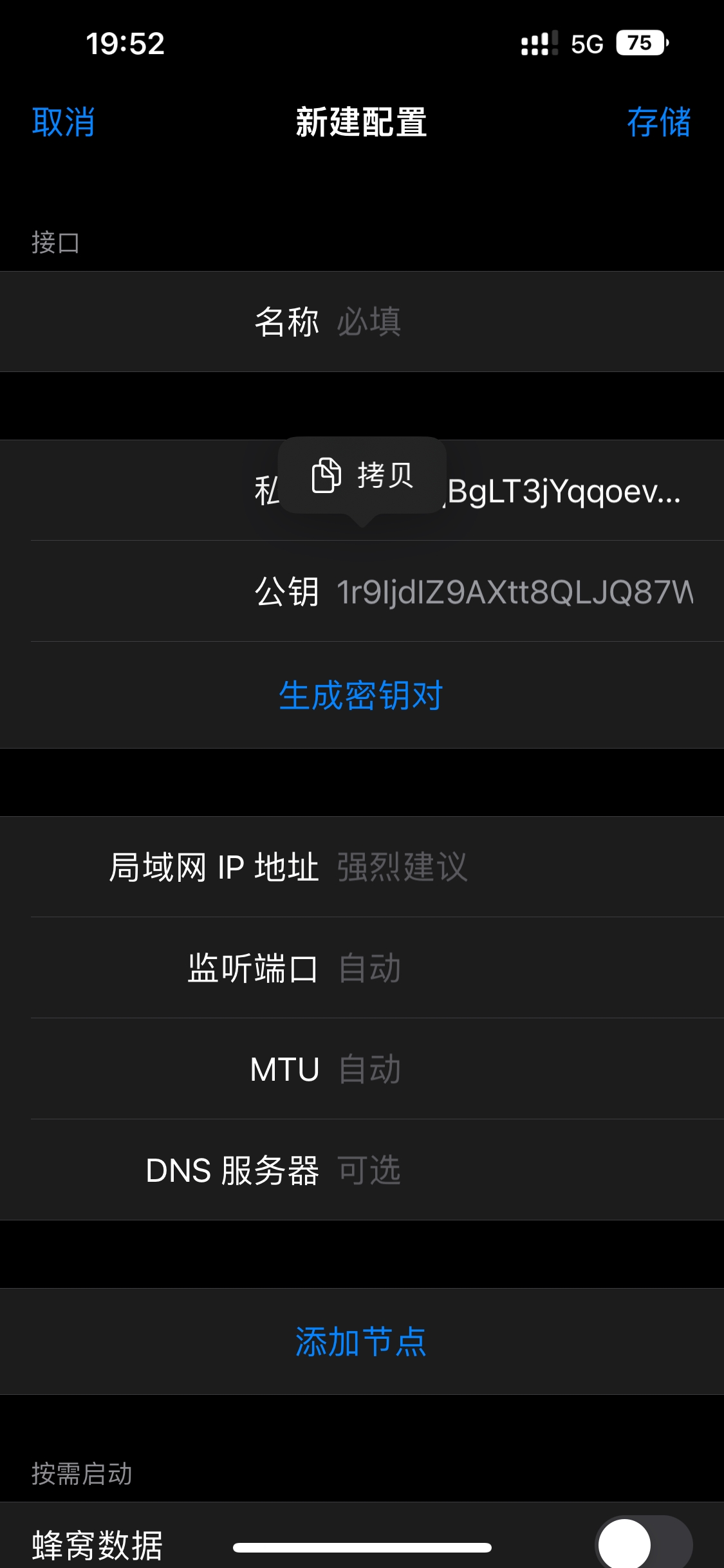 第六步:打开wireguard app添加隧道-手动创建-生成密钥对,将生成的公钥和私钥都复制出来,保存在备忘录并做好备注公钥、私钥。本次教程中wireguard的唯一作用就是生成一对密钥。