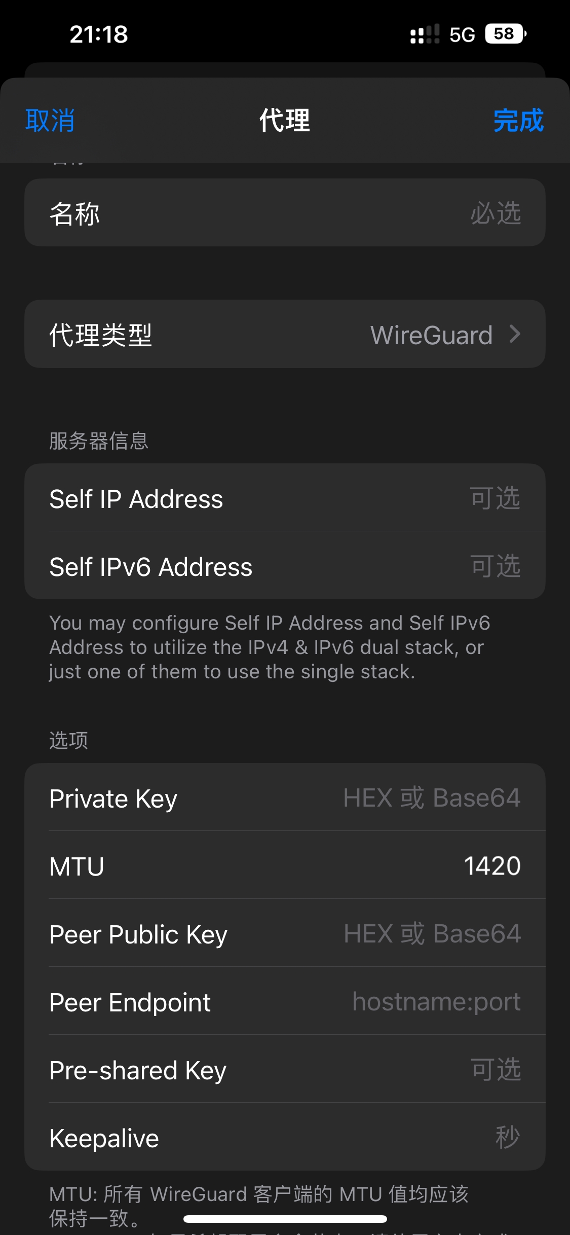 正常情况下这时候surge会有个通知,通知内容一个是提示公钥是否一致,另外一个是生成配置,点击生成配置的通知会自动跳转到系统邮件app,里面就是生成的wireguard配置,按照里面内容,进入surge首页-代理服务器-添加代理-代理类型选择wire guard 填入里面相应字段即可。